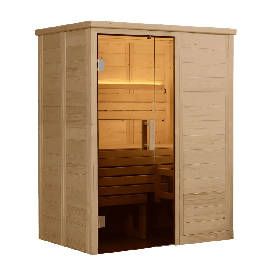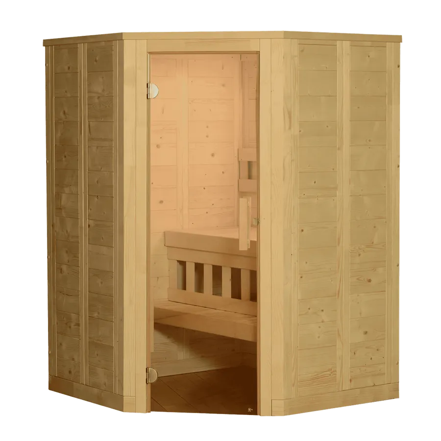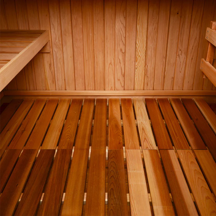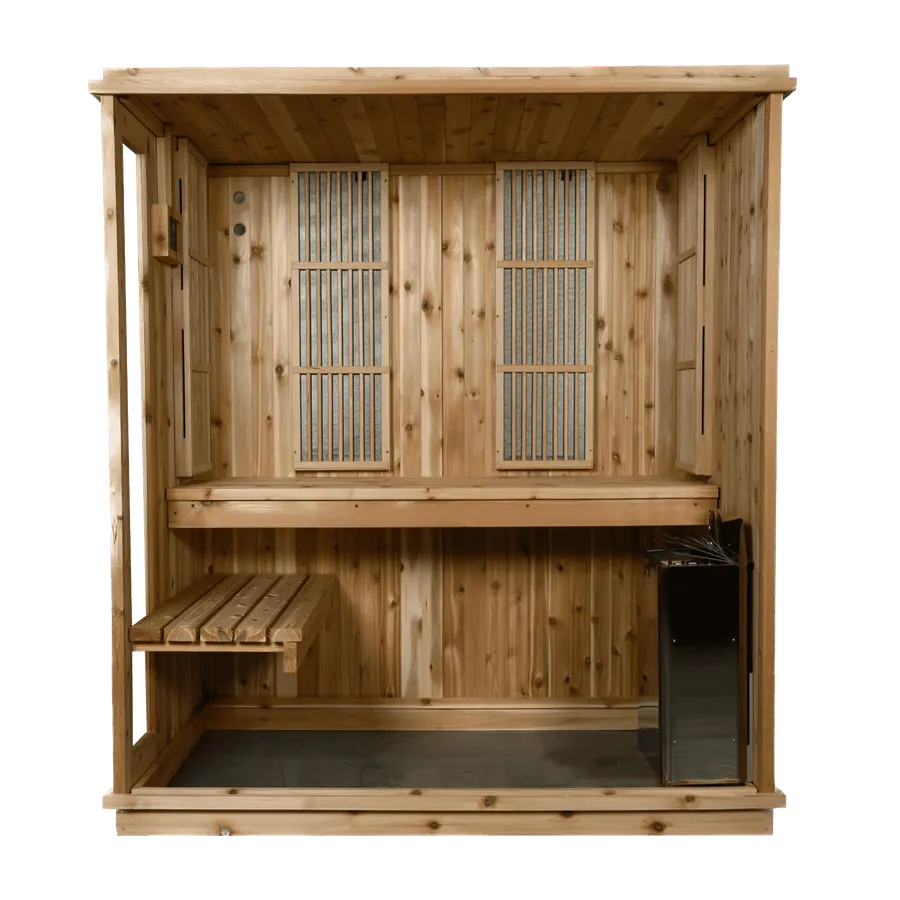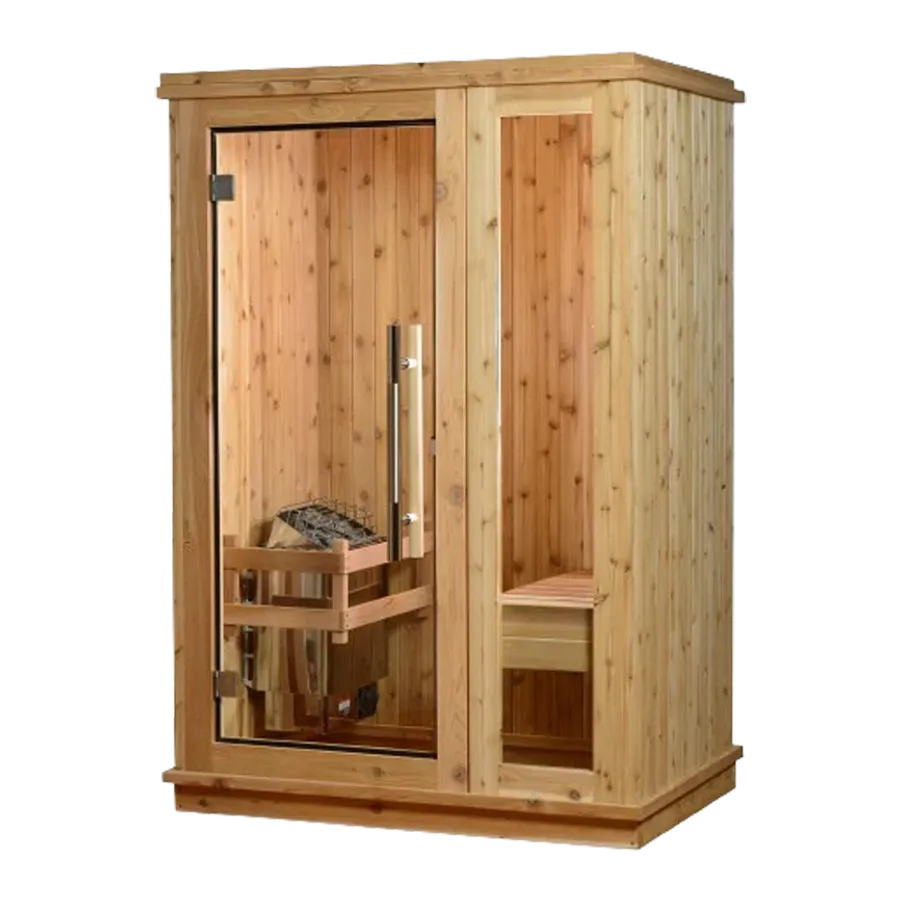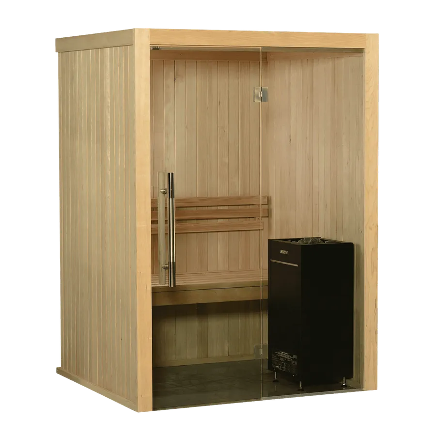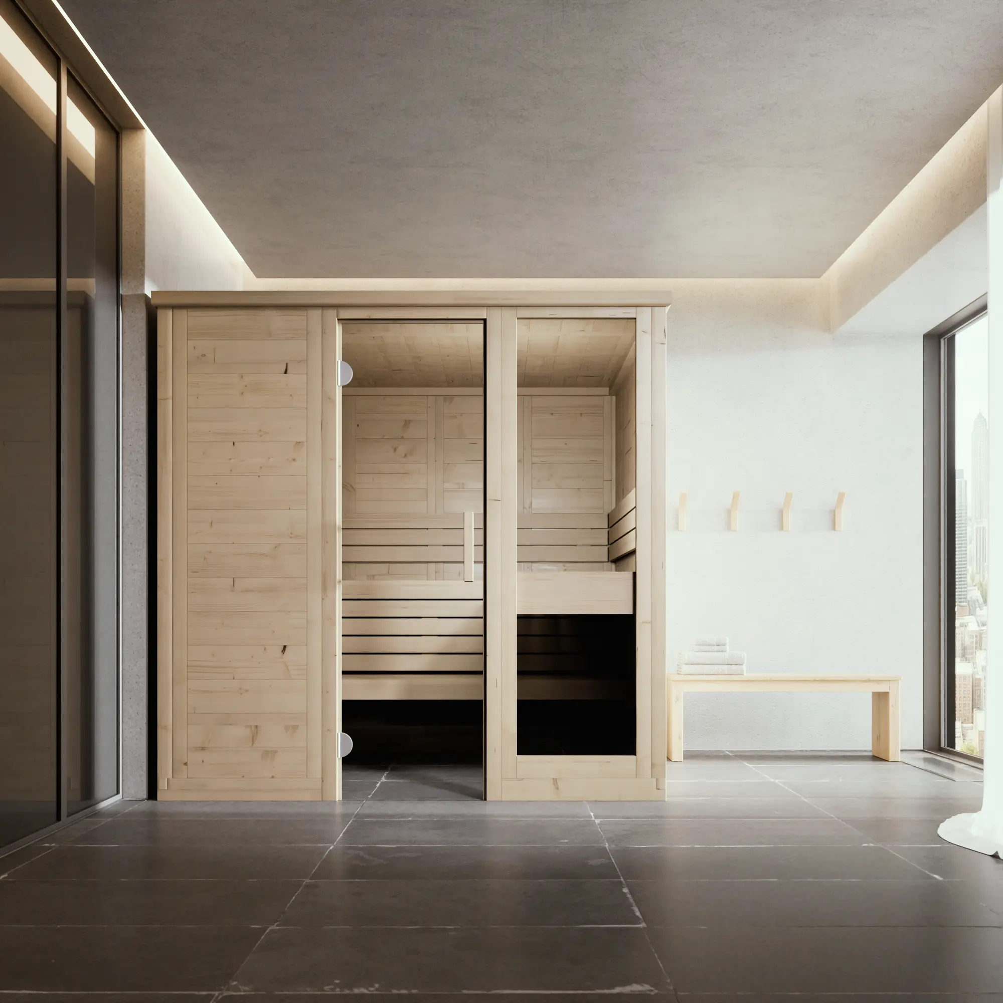 The Auburn 2-3 person indoor sauna seats three people in a compact design with large windows for an open feel. Choose the top bench for more heat or the lower bench for a cooler experience. The Harvia 6kW heater reaches 180ºF in an hour or can be delayed up to eight hours. It fits seamlessly into your space using existing flooring.